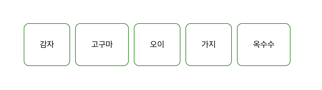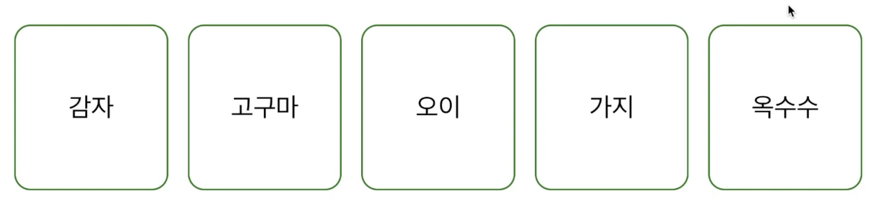 이 화면을 최대한 비슷하게 만들어보려고 한다.function App() { const flex = { display: 'flex', alignItems: 'center', justifyContent: 'center', height:'100vh' }; const style = { padding: '30px', border: '1px solid green', borderRadius: '10px', margin:'5px' }; return ( <div className='container' style={flex}> <div style={style}>감자</div> <div style={style}>고구마</div> <div style={style}>오이</div> <div style={style}>가지</div> <div style={style}>옥수수</div> </div> ); }