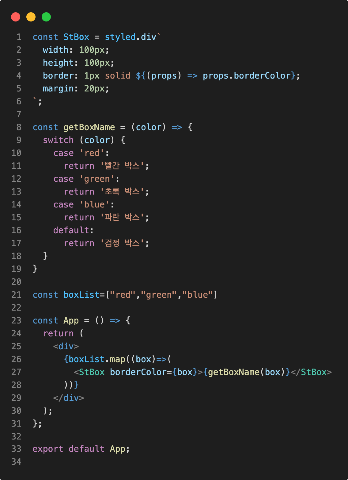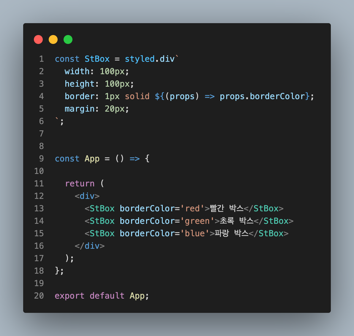 이렇게, 컴포넌트 별로 색상을 달리 해줄수도 있다. StBox 코드를 보면, 백틱 안에 코드가 담겨있기 때문에 자바스크립트를 사용하기 위해 ${} 안에 코드를 넣어준다. 부모에게 색상을 받아오기 위해 콜백함수에 props를 인자로 넣어줘서 색상을 받아온다.