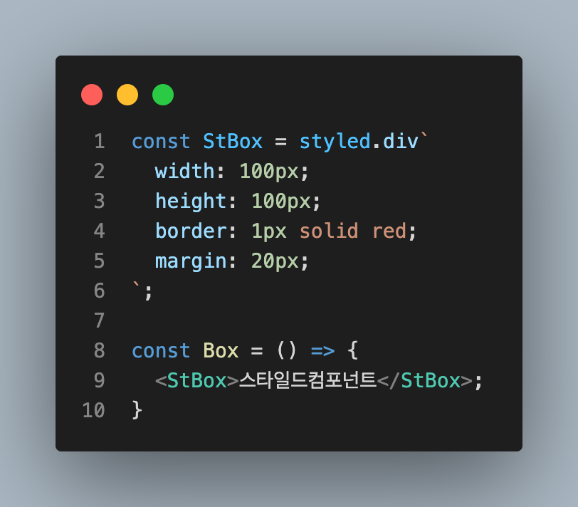 스타일을 변수에 담아 백틱` 을 감싸서 스타일을 적용해준다. 그리고 컴포넌트 안에 스타일 컴포넌트를 적용한다.