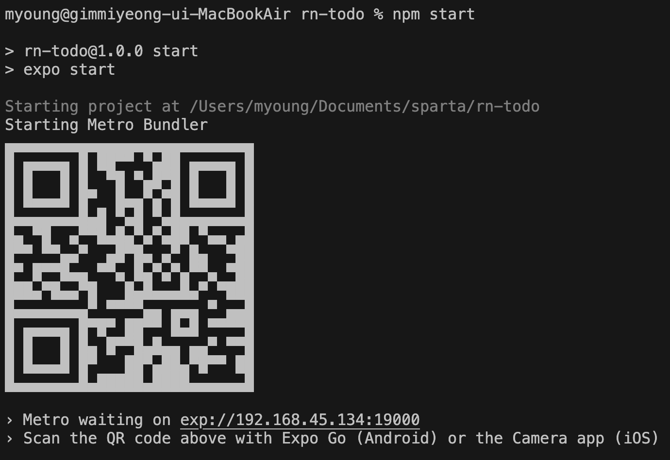 이런 QR이 생기는데, 본인 휴대폰 카메라로 찍으면 아까 설치된 Expo Go 어플을 통하여 내가 만든 로컬 화면을 내 휴대폰에서 볼 수 있다.
