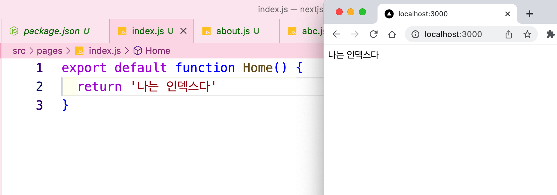 이런식으로 위에 abc.js도 만들어줬고 3000/abc 로 접속해도 페이지가 잘 뜨고 있다.