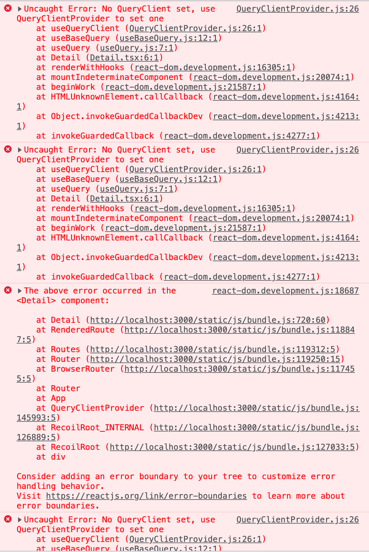 @tanstack/react-query이걸 import 해와야되는데 그냥 react-query를 import 하고 있었다 ㅠㅠㅠㅠ